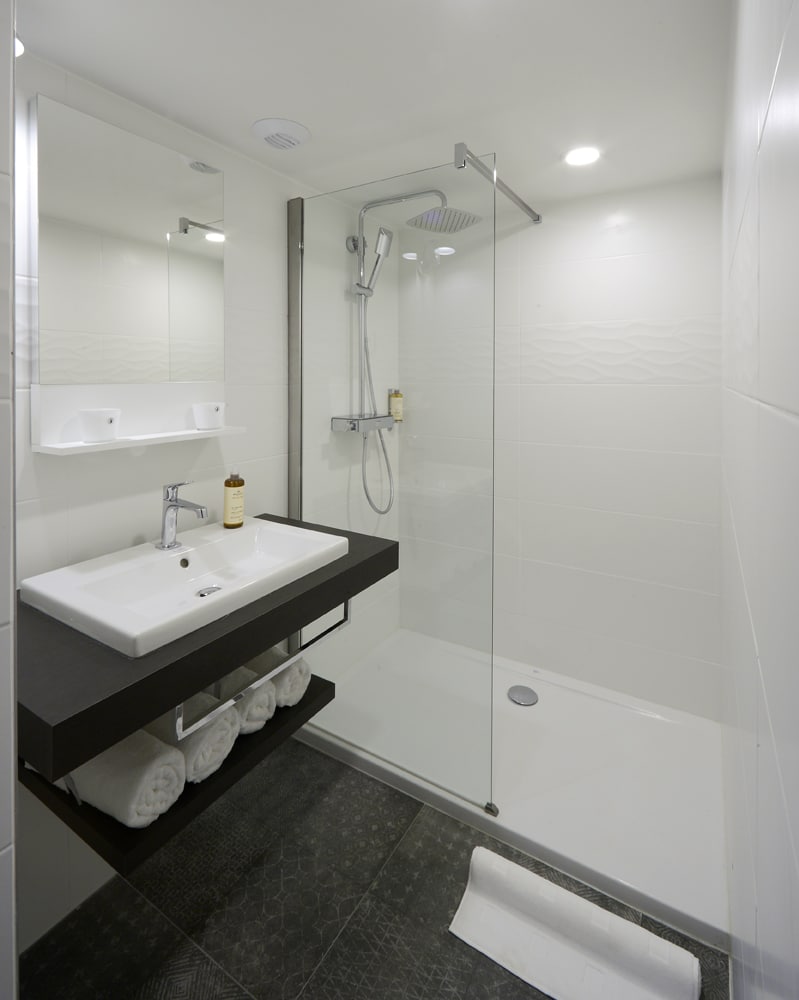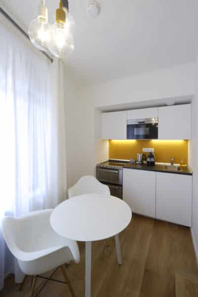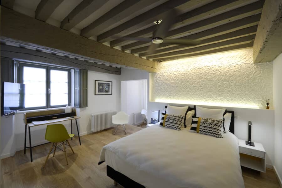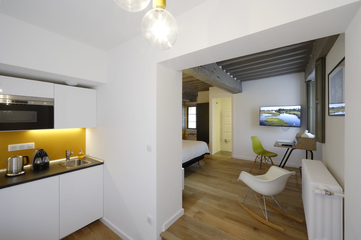 Chambre studio n°8 située au deuxième étage d’un bâtiment du 17ème. Elle est décorée dans le style contemporain et meublée de meubles de designers. Parquet de chêne au sol.
